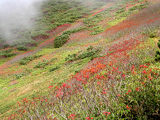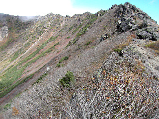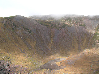 | 山行記 | ●蝦夷富士とも云われる後方羊締山の山容は、他の○○富士と称されるふるさと富士の中でも最も富士に近い。登山道はいろいろあるが、その中でも一番コースタイムの短いこのコースをとることにした。 ●半月湖近くの駐車場にレンタカーを停めて、まずは緑が美しい樹林帯の中をゆるやかに登っていく。しばらく歩くとしだいに道は急になり、振り返ると、隣のニセコアンヌプリを中心とする山塊が樹間に見えてくる。 ●四合目あたりからは、端正な円錐形の外観から想像できる急坂が休むことなく続くので、かなりきついがここはひたすら頑張るしかない。緑濃かった木々は中腹では紅葉しており標高が上がってきたことを実感する。 ●登山道は、標高が上がるにしたがい傾斜を増し、やがて、九合目の避難小屋への分岐に着く。とにかくまず山頂を踏んでおきたいので、避難小屋とは反対の左へ進む。九合目からは傾斜も若干緩くなり、程なく火口の一角に着く。 ●後は火口の周りをお鉢巡りするのだが、最初に現れたピークは山頂ではないらしく、さらに進むと三角点のある後方羊締山山頂に着く。本来なら北海道の名山を見渡す大展望をほしいままにするところだろうが、残念ながら山頂付近はガスに包まれて展望は無かった。 ●山頂のピークからさらにお鉢を巡り、避難小屋の下降点から避難小屋へ向かう。山頂付近の紅葉はすでに終わりかけていたが、ナナカマドの赤い実がよく目立っていた。 ●避難小屋に着くと山バッジを購入し、少し休憩した後下山にかかる。避難小屋から先程の九合目の分岐まで行き、そこからは来た道をひたすら下った。下山途中で初めてエゾシマリスに出会えたのは幸運だった。 |