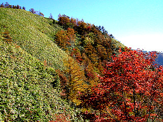 | 青空と明るい稜線を見るだけでワクワクする | 紅葉とササの稜線 | 寺田小屋山山頂 |