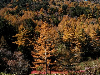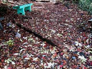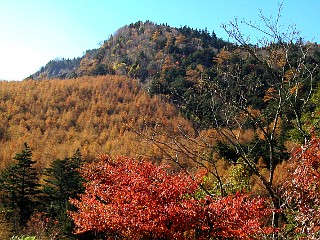 | 色とりどりの落ち葉が積もる登山道 | 敬慎院付近から見る紅葉に彩られた山頂部 | 敬慎院付近のカラマツの紅葉 |