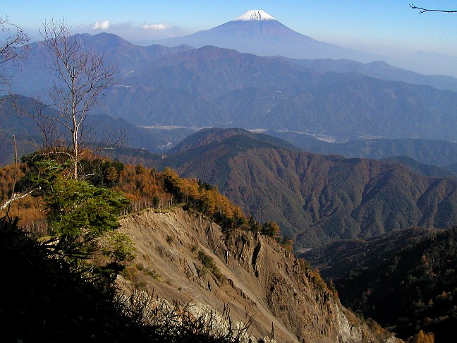 | 山行記 | ●この日はお休みで、天気がよさそうなので、早朝に豊川を出て七面山へ行くことにした。白糸滝がある羽衣の駐車場に車を止め登り始める。登山道は敬慎院へと続く表参道で、広く歩き易い。早朝から年配の人達が休み休み登っている中、上から僧侶と思われる人も下りてきて度々出会うが、すれ違う時に必ず「ご苦労様です」と声をかけてくれる。さすがは信仰の山だ。 ●登山道は、落葉した明るい樹林の中をジグザグに登っていくが、色とりどりの落ち葉が積もり気持ちがいい。信仰で登る年配の人達への配慮か各所にベンチが置かれている。展望はよくないが、ところどころ樹林の切れた所から南アルプスを展望することができる。 ●山門をくぐると敬慎院の境内に入るが、とりあえず山頂を目指す。紅葉が真っ盛りで、モミジやカラマツの紅葉が眩しい。カラマツの落ち葉が積もるふかふかで気持ちのいい登山道を緩やかに登るとナナイタガレと呼ばれる崩壊地の縁を通る。ここからの富士山の眺めは見事だ。 ●ナナイタガレから少し歩けば七面山山頂に着く。山頂は広場となっているが周りに樹木があるため展望が利かない。天気は上々で気持ちがいいので、暫くそこで過ごした後、先程素通りした敬慎院に寄っていくことにした。 ●敬慎院は、山上にあるとは思えない程の立派な伽藍が立ち並び、山にいることを忘れてしまいそうなくらいだ。中でも随身門とよばれる門越しの富士山は見事で、まるで額縁に入った絵画のようだ。そこで絶景の富士山を十分堪能した後、来た道を戻り、登山口にあった白糸滝を見物して帰路についた。 |