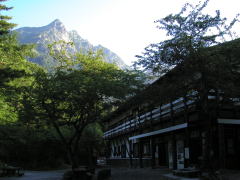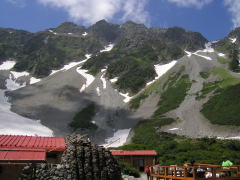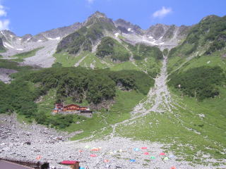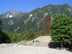 | 釜トンネルのゲート | 明神から見上げる明神岳 | 横尾の吊橋 | 涸沢小屋 |