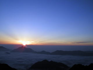 | 穂高岳山荘から見るジャンダルム | 夜明け前の常念山脈と雲海 | 常念岳の上から昇る御来光 |