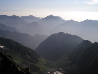 ![]() 奥穂高岳山頂から見た焼岳、乗鞍岳 |