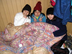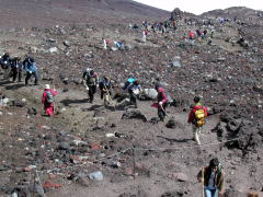 | 山行記 | ●富士山は、登らぬ馬鹿、二度登る馬鹿。という言葉があるとおり、日本一の山だから、一回は登ってみるものだが、二度登る程いい山ではないという意味だろう。そんな言葉を意識してか、25年前に一度登って以来登ると言う話すら出たことが無かった。しかし、山に興味の無い人でも一度は登っておきたいと言う人は多く、今回そんな話があったとき、久しぶりだから登ってみようかと思い、連れて行くことにした。 1日目●早朝豊川を出発し富士宮新五合目の駐車場に着くが、予想通り満車状態。しかしこの時間は御来光目当ての人たちが下りてくる頃なので、暫く待つと、案の定帰る車があったのでそこに入れさせてもらい、登り始める。今回は頂上で泊りなので余裕だ。 ●六合目までの平坦な道でオーバーペースになるのを押さえ、これからの単調な登りに備える。とはいっても、まるっきり山登りが初めての人たちが多く、歩きが長くなれば長くなるほど、自然と速い人遅い人に分かれてくる。今回の参加者も気が付くと3チームに分かれ、速いチームが遅いチームを待ち、遅いチームが来るとまた次へ進むという繰り返しになる。頂上が近付くと空気が薄いのも影響して、だんだんその差は開いてきたが、とりあえず富士宮頂上へ全員到着することが出来た。 ●富士宮頂上から最高点である剣ヶ峰を目指す。最後はザレザレの急登で、何かにつかまっていなければ滑り落ちてしまいそうな急坂だが、頑張って全員山頂に到着した。天気は山頂付近だけなのかガスがかかっていて展望が無く、しかも寒い。暫く登頂を喜んだ後、さっさと宿舎に帰り食事を済ますと山小屋特有の湿っぽい布団にもぐりこんだ。 2日目●翌朝、御来光を期待したがガスっていて見えそうに無いので仕方ない。ところが、下山は御殿場道からにしようとお鉢を歩いていると、次第にガスが薄くなり始め、太陽が見え始めた。諦めたところなので、意外な展開に一同が沸いた。 ●ガスはますます取れてきて、空はついには綺麗な晴天へと変った。眼下には山中湖や愛鷹山、駿河湾が見渡せた。御殿場道をザクザクと下り、宝永山に寄って帰ることにする。富士山の中でも新しい火口なので、草木の生えない火山らしい山だ。この大らかな景観を楽しんだ後、富士宮新五合目の駐車場まで戻り、帰路に着いた。 |
