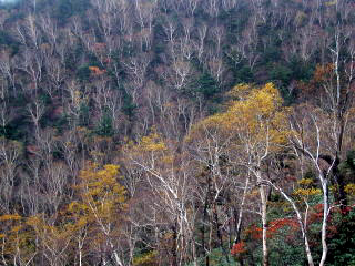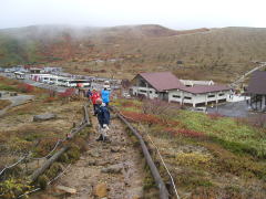 | 山行記 | ●台風は去ったがこの日も朝から雨模様。結局今回の山行は不正解かと思うような天気だ。まあ草津温泉は楽しんだし、たまにはこういうこともあるだろうと思い、宿を出て志賀草津道路を上って行く。標高が上るとガスが多くなり、景色は見ることができない。それでも、時よりガスの切れ間から見える紅葉は息をのむほど美しい。 ●白根レストハウスのある駐車場に着き、まずは逢ノ峰へ登る。弓池を見ながら植生保護のため丸太とロープで仕切られた道を進む。天気はしだいに快方に向かっており、ガスも取れ始めて、紅葉の山肌や湯釜方面も見え始めてきた。逢ノ峰は何の目印も無いが一番高いところが山頂だ。 ●逢ノ峰からは一旦下り舗装道路を横切って白根山の最高地点を目指す。所々木道のある整備された遊歩道を歩き、まずは展望所へ寄ってみる。このときはガスで何も見えない状態だった。展望所から少し戻り、遊歩道を万座温泉方面に進めば、本白根山遊歩道最高地点に着くが、最初は案内板が倒れていて、はたしてそこが最高地点かがわからなかった。 ●帰りは先程の展望所を通り、鏡池を見るコースをとる。こちらは登山者も少なく、樹林や沢など変化のあるコースだ。紅葉と白樺のコントラストが美しい山肌を見ながら、道は先程の舗装道へ出る。今度は逢ノ峰を迂回するコースで駐車場へ戻った。 ●駐車場から今度は湯釜を見に行く。天気は急速に回復し、日差しが暑いぐらいの陽気になり、湯釜への登りは汗をかく程だ。硫化水素の溶け込んだコバルトブルーの湯釜を見物した後、志賀草津道路を渋峠へ向かう。渋峠への高原道路沿いの紅葉は最盛期を迎えており、車を停め写真を撮っている観光客が多く見られた。 ●群馬県と長野県の県境にある渋峠からは渋峠リフトに乗って横手山を目指す。ここはスキーでは何度か来たことがあるが、無雪期に来るのは初めてだ。まずは横手山頂ヒュッテで評判のきのこ雲スープを頂いた後、山頂を目指す。横手山山頂はヒュッテの裏を少し行ったところで、先程登った草津白根山などの展望が広がっていた。 ●帰りもリフトで楽々下山。帰路に着いた。帰路、松代付近で見事な虹が見えたので急遽松代PAに車を停め虹が消えるまでそれを楽しんだ。。 |
