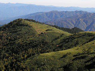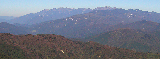 | 山行記 | ●午前中総合検診を受けたが、1日休みをとっているし、何よりも雲一つない青天だ。これは山に行くしかないと思い、少し遠いが富士見台へ行ってみることにした。神坂峠が近付くと展望が開け、笠置山の美しい山容が望めるようになる。峠を越えてすぐに左に折れ萬岳荘の近くに車を置き、早速登り始める。 ●稜線は一面に笹が茂る気持ちのいい登山道で、隣の神坂山や背後には大きな恵那山を常に見ながらの登山となる。神坂小屋の手前からは目指す富士見台も見えてくる。南アルプスや御岳など、次第に広がってくる展望を楽しみながら登れば、あっけなく富士見台山頂に立つことができる。 ●富士見台山頂はまさに360度の展望で、今まで見えていた恵那山や南アルプス、中央アルプス、御岳に加えて、大川入山や蛇峠山、遠くは乗鞍岳や北アルプスの山々、白山まで一望できる。こんな大展望はそうそう見られるわけではく、何時まで眺めていても飽きないが、とはいってもきりがないので、少々未練を残しながらも下山を開始することにした。 |