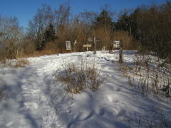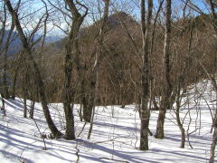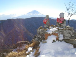 | 山行記 | ●御坂山塊は、以前毛無山から王ヶ岳まで歩いたことがあったが、その主峰であり日本300名山でもある黒岳はまだ登ったことがなく、その機会を狙っていたが、たまたま今年の雪遊びの候補地を探していたときにそれを思い出し、雪遊びにも手頃そうなので隣の釈迦ヶ岳とセットで登ってみることにした。 ●早朝、どんべい峠に着いた時は、冬のこの時期まだ暗さの残る頃だ。早速身支度をして登り始める。トレースは付いているが、所々吹き溜まりの部分は消えかけている。冬枯れの木々の間から差しこむ弱い冬の日差しが気持ちいい。樹林が切れたところではまだモルゲンロートの赤みが残る大菩薩連峰が望める。 ●黒岳山頂は広場になっていて、三角点やおなじみの山梨百名山の木柱等があるが展望は今ひとつなので、案内に従って展望台へ行ってみる。さすがは展望台というだけあってその展望は素晴らしい。河口湖の背後に聳える富士山、御坂山塊はもちろん南アルプスもほぼ全山見ることができた。 ●しばらく展望を楽しんだ後、すっかり明るくなったどんべい峠まで一旦戻り、今度は反対側の釈迦ヶ岳を目指す。府駒山を越え快適な雪の登山道と時折広がる展望を楽しみながら歩けば、およそ1時間程で釈迦ヶ岳山頂に到着する。 ●釈迦ヶ岳山頂にはお地蔵様や石碑が建てられている。狭い岩上の山頂からは御坂の稜線の向うに富士山、南アルプスの大パノラマ、金峰山や大菩薩連峰など360度の大展望が広がる。ここでも十分展望を満喫した後どんべい峠まで戻り帰路に着いた。 |