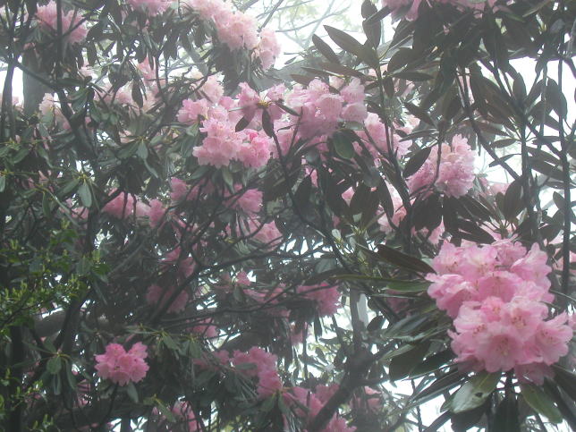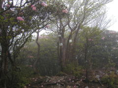 | 山行記 | ●鈴鹿と言えば7マウンテンを思い出すが、たまにはそれ以外の山も登ってみたくなる。隣の烏帽子岳は2回登ったことがあるが、この山は登り残していたので今回登ってみることにした。 ●雨模様の天気の中、鞍掛トンネル東口に車を置き、登山届けを書いて出発する。鞍掛峠を越え、まずは焼尾山に寄っていくことにする。焼尾山付近ではシャクナゲが丁度見頃を迎えており、ガスの中、晴天のときとは一味違う美しさを見せていた。足下にはイワカガミがまた見事で、思わぬ幸運に雨の不快さを忘れるほどだった。 ●。焼尾山からは一旦分岐に戻り、目的の三国岳を目指す。ムシカリやチゴユリなどが咲く稜線上をアップダウンを繰り返しながら進めば、やがて三国岳の最高点に到着する。木々に囲まれて展望も無い最高点にも山名の表示が立てられているが、山頂といわれているのはもう少し先のようだ。少し下り気味にさらに進むとまたまた樹木に囲まれた山名表示のある場所に出る。どうやら山頂はここのことを言うようだ。 ●この先に三角点もあるらしいが、雨も降っているのでそこまでは行かずに戻ることにする。帰りは再び焼尾山でシャクナゲを楽しんだ後鞍掛トンネル東口の駐車場へ戻った |