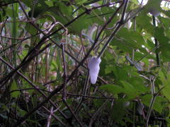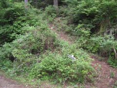 | 山行記 | ●イメージ的にこの三山を縦走するのは大変なようで残されてきていたが、愛知の130山完登も見えてきた今、1度に3山をこなせるということは魅力でもあり、ここへ足を運ぶことにした。 ●県道から林道に入り登山口まで向かうが、道に張り出した枝や草が当たるので慎重に進み、登山口を少し通り過ぎた辺りで方向転換し道が少し広くなったところで駐車して登山口から登り始める。 ●植林帯の急斜面をジグザグに登っていくと程なく県境稜線に出る。ここから右に行けば弓張山方面、左に行けば浅間山なのでまずは左の浅間山を目指す。分岐点から見えるぐらい近くにある浅間山山頂には立派な祠があるが、植林帯の中なので展望も無く薄暗い。 ●次は先程の分岐を越えて弓張山を目指す。県境稜線は愛知県側が植林帯で静岡県側が雑木林となっておりヤマツツジが見頃を迎えている。大きなアップダウンも無いまま快適な稜線沿いの道を歩いていくといつの間にか弓張山に着く。意外と狭い弓張山の山頂も樹木に覆われ展望も無く薄暗い。 ●さらに進むと植物の種類も多くなり、モチツツジやフタリシズカ、ヤブウツギ、ホウチャクソウ等を見ることができ、キンランも咲いていた。また、木や草の茎に生みつけられたアオガエルの卵も目立った。 ●やがて城山との鞍部で林道が横切りさらに山道を進むと道が不明瞭になってきたが、感を頼りになんとか電波中継施設の建つ城山の頂上の一画に出ることができた。途中ツクバネウツギやハナイカダ、ギンラン等を見ることができた。 ●城山山頂は電波中継施設の西側の樹林の中にあり二等三角点と山名札が置いてある。城山からは不明瞭だった往きの道は通らず林道出合まで舗装道を下りることにした。その先もしばらく県境の静岡側を走る林道を歩き、林道が登山道と離れる辺りで県境稜線上の登山道に戻り、後は来た道を戻った。 |