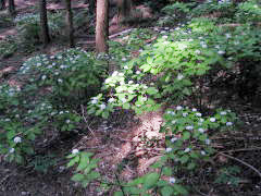 | 山行記 | ●愛知の130山完登を目指して登っているが、植林帯の中を歩くことが多い。雑木林なら冬には葉が落ち明るくなるが、針葉樹は葉が落ちず年中薄暗く植物の種類も少ないことが多い。 ●この大森山も最初から植林帯が続き、やはりここも同じかと思ったが、登山道沿いにコアジサイが多く、木漏れ日の中で綺麗に咲き揃っており一気に印象が変わった。 ●しかし、山頂は他の愛知の山と同じように植林帯の中で、展望も無くて薄暗く、コアジサイが無ければ随分印象が違っていたに違いない。 |