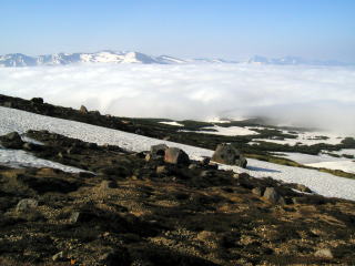 | 山行記 | ●早朝、旭山動物園へ行くという妻をホテルに残し、レンタカーで旭岳ロ−プウェイの乗り場となっている旭岳温泉へ向かう。旭岳温泉の手前で旭岳が見えてきた。ロープウェイの駐車場に着くが始発までには時間があるので、周辺を散歩する。まだ残る雪の合間にエゾイチゲやエゾコザクラなどが咲いている。また、ロープウェイ下には湿原があり、ミズバショウやエゾリュウキンカが満開だ。これは帰りに見ていくこととして、始発のロープウェイで姿見駅まで上がる。本来ならロープウェイに乗らず、花を楽しみながら登りたいところだが、今日は帰る日で、飛行機の時間もあるので仕方がない ●姿見駅を降りると一面の雪世界。ここは吹き溜りになるのかかなりの雪の量だ。仕方がないのでアイゼンとスパッツを付けて歩き出す。姿見の池を過ぎた辺りから登山道も地肌が見えてくるが、まだまだ雪の深いところもあり、アイゼンを取るタイミングが難しい。雪の融けた部分には早くもメアカンキンバイやコメバツガザクラなどの高山植物が咲き出し、特にミネズオウやキバナシャクナゲなどは北海道らしいスケールの大きな群落を形成している。 ●やがて、登山道の雪は無くなり、火山らしい草木の生えない岩礫の斜面を登るようになる。右手にはいくつもの火口から噴煙を上げる地獄谷、左手には雲海の上に浮かぶ、トムラウシや十勝岳を擁する大雪連峰を見渡すことができる。変化の無い急な斜面をひたすら登るのはきついが、要所要所に合目や標高を表示した木柱が立てられていて励みになる。ニセ金庫岩からは火口壁を登り山頂を目指す。火口には火山活動を監視する装置とワイヤーが張られており、ここもまだ火山活動が盛んであるということをうかがわせる。 ●ニセ金庫岩からは、ひと登りで旭岳山頂に着く。山頂には、三角点や方位盤、山名表示の木柱などがあり、360度の展望が広がっている。黒岳から反対方向には十勝岳へと続く大雪連峰が一望できる外、地獄谷の向こうにロープウェイの姿見駅方面を俯瞰することができる。なかでもトムラウシの特徴のある山頂部のドームは、周囲の山々の中でも一際目を引く。もう少し雲が少なければ北海道中の山々が見渡せたことだろう。 ●山頂にいると。ついつい時の経つのを忘れてしまうが、飛行機の時間が気になるのでしぶしぶ下山を開始する。姿見の池周辺では観光客が貸し出しの長靴を履いて散策している。雪も朝と違って軟らかくなっているのでアイゼンは付けずに姿見駅まで戻ることができた。 ●下山後は、旭岳温泉で汗を流した後、旭川ラーメンを食べ、旭山動物園へ妻を迎えに行き、旭川空港へ向かった。 |