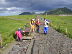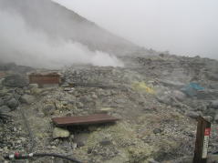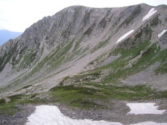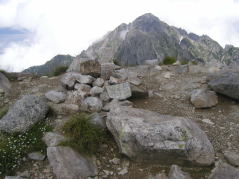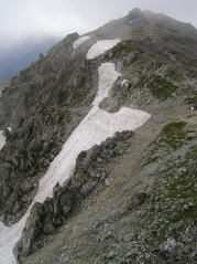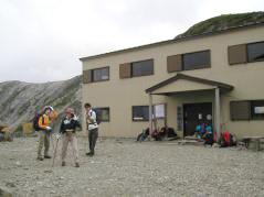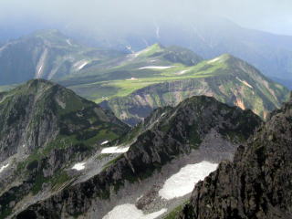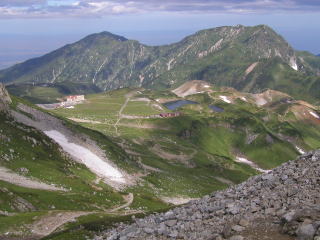 | 山行記 | ●天候は回復してくるという予報を頼りに、立山駐車場からケーブルカーで美女平。そこからバスで室堂へ向かう。バスからは、黒い雲から黒い筋が地上に下りているのが見える。おそらくその下では激しい夕立が降っているに違いない。 ●室堂に着くが、雨がしとしと降っているので、カッパを着て出発する。ところが、少し歩いたところで雨が上がり、日も差し始めたのでカッパを脱いでさらに進む。ヨツバシオガマやウサギギク、イワイチョウなど、挙げればきりがないほどの種類の高山植物が咲き競っている。天気は急速に回復し、一ノ越に着く頃には青空になっていた。 ●雄山の急登を登りきり、雄山神社で御祈祷を受け、岩稜を大汝山へ向かう。大汝山は立山の最高点で、展望も良く、特に剣岳を間近に見ることができる。直下には休憩所もあるのでここまで来る人も多いのだろう。もう少し進むと富士ノ折立。ここからは急な下りとなり、緩やかに登り返したところが真砂岳だ。この辺りは砂礫の稜線道で、展望もよく気持ちがいい。 ●真砂岳を下ると今度は別山の急な登りが待っている。急だがそれほど長くはないので、道沿いに咲くトウヤクリンドウを見ながら少し頑張れば祠のある別山山頂に着く。一段と間近に迫る剣岳を見ながら、稜線沿いを剣御前小屋へ向かう。 ●公衆便所のある剣御前小屋からは直接剣山荘を目指すグループと別れ、剣御前にも登っておくことにする。剣御前への稜線は訪れる人も少ないようで、道沿いの高山植物は豊富だ。チングルマを始めとしてクモマグサ、ハクサンフウロ、ミヤマキンバイなど多くの種類の高山植物が咲いていた。剣御前山頂からは稜線沿いに剣山荘へ向かうコースもあるようだが通行止めのようなので、一旦剣御前小屋まで戻り、剣御前を巻くように付けられた道を通り今日の宿泊地である剣山荘を目指した。 ●翌日は、予想はしていたが生憎の雨。剣岳を目指すかどうかを協議した結果、私ともう1人が剣岳を目指すことになった。居残り組を山荘に残し、カッパを着て登り始める。雨もしだいに強くなってきたので、クサリ場や鉄ハシゴの続く険しい岩稜を慎重に通過し、なんとか剣岳に到着することができた。雨は相変わらず強く降っているので、頂上では記念写真を撮っただけで早々に撤退開始。慎重に岩稜を下って、居残り組の待つ剣山荘へ戻った。 ●雨は多少弱まったようだがまだ降っているので、居残り組もカッパを着て帰途に着く。昨日取ったコースは残雪も多く歩き難かったので、剣沢小屋を通るコースをとる。このときは雨が上がって、快適に剣沢小屋を越え、徐々に傾斜の増す登山道を頑張って別山乗越まで登った。そこからは雷鳥沢の急坂を一気に下り、地獄谷を抜けて室堂へと登り返した。 |