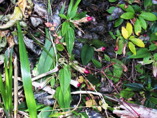 | 山行記 | ●田峰観音を過ぎ、細い舗装路をしばらく進み、鋭角に曲がる舗装路を行くと舗装は途切れ、建設中の林道となる。登山口を発見できず、重機の置いてある林道終点で方向転換して戻ると、すぐのところに登山口が見つかった。 ●邪魔にならないところに車を置き歩き始める。林道の法面を登ると植林帯の登りとなるが、天気もよく意外と明るい。ツルリンドウの赤い実やガンクビソウ、コウヤボウキなどが出迎えてくれた。 ●山頂近くになると雑木林となり、紅葉が綺麗だ。山頂は木々に囲まれているが、大鈴山や平山明神山を見ることができる。 ●来た道を戻り、車で林道を下りると、往きには気付かなかったが、林道脇にはヤクシソウが一面に咲いていた。また林道途中からは、鞍掛山の姿も見ることができた。 |