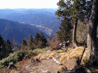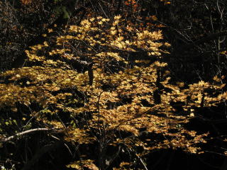 | 山行記 | ●紅葉を求めて夕森山を目指す。不動滝駐車場に車を停め、林道を歩く。夕森山登山口はそこからすぐのところにある。登山口には小屋があり、小屋の横を過ぎ、沢沿いに登っていくと竹林に入る。道は林道を横切り、カラマツの落ち葉がふかふかで気持ちいい登山道を登っていく。 ●紅葉も美しく、視界の開けたところでは恵那山を眺めることができる。青い空が広がる頭上にはナナカマドの真っ赤な実やムラサキシキブの紫の実、足元には霜のまだ融けない色とりどりの落ち葉やトチバニンジンの実などを見ることができた。 ●最後の急登を登りきれば、360度の展望が広がる夕森山山頂だ。雪をいただいた御岳が間近に迫り、振り返れば恵那山や、山間に広がる付知町の町並を見ることができる。山頂には鉄製の櫓があるが、腐食が激しく危険なため登ることはできない。外に祠や三角点のある山頂には大きなナナカマドの木があり真っ赤な実が青空を背景に映えていた。 ●少し寒いが天気も上々で気持ちがいいので山頂ですっかり長居をした後、往路を戻り下山。せっかくなので滝見物をしていくことにした。滝見物の観光客に混じって杣樽滝、不動滝と迫力のある滝をめぐり、付知町にこの年の4月に開業したばかりの「付知峡倉屋温泉おんぼいの湯」へ寄って帰路に着いた。 |