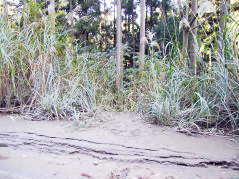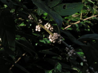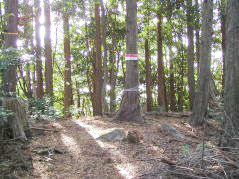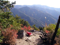 | 山行記 | ●理由はないが、奥深く暗いイメージが強く、近くの山なのに今までついつい残してしてきてしまっていた風頭山へ登ってみることにした。県道から橋を渡り一旦左方向へ行き、普通車では1回で切り返せない程の鋭角を右へ曲り林道を行く。途中まで舗装されているが、小枝や小石の落ちている狭い林道は、やがて舗装も途切れ、さらに進むと広場があるので、車はここに停めさせてもらう。 ●未舗装の林道をさらに歩いていくと風頭山の登山口がある。登山口から戻る方向に林道が続いており、しばらくはその植林地帯の暗い林道を歩く。やがて林道は二つに分かれるので、案内のとおり右の沢に沿って登るやや狭い林道を行く。この林道はコンクリートで舗装されているが植林の小枝や葉が落ちたままになっている。沿道にはイズセンリョウの白い実やモミジガサの花などが見られ、木々の間からは太陽の光が差し込み、幻想的な雰囲気を醸しだしている。 ●傾斜がきつくなりススキの斜面をひと登りすると林道に出る。林道を横断し、反対側の沢筋を登っていく。やがて、道は沢から離れジグザグの登りとなる。カンアオイの葉が目立つその道を登りきると稜線に出るのでそこを左へ進む。 ●稜線道は、展望の開けるところもあり気持ちがいい。道が傾斜を増しそれを登りつめれば山頂だ。山頂手前に、イワカガミの葉が固まって生えており、花の咲く頃もう一度訪れてみたくなる。山頂は木々に囲まれ展望が利かないが、すぐ下の休憩所からは、南方向への展望が開け、本宮山や五井山、三河湾から渥美半島の山々まで見渡すことができる。下山は来た道を戻る。 |