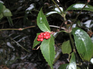 | 山行記 | ●道樹山、弥勒山から下山したが、少し物足りないし、時間もまだ十分あるので、同じく東海自然歩道が通る山星山と高根山に登ることにした。 ●登山口は今下山したばかりの細野キャンプ場から目と鼻の先で、紅葉で有名な定光寺の下にある正伝池の近くで、駐車場もある。 ●まだ雪の残る駐車場に車を置き、登山口を探す。正伝池の反対側に東海自然歩道の案内板があり、そこが登山口となっている。 ●まずは正伝山に登っておこうとコースを外れて探してみるが、途中で道が消え、高いところを探してみるがどうもよくわからないのでコースに戻り高根山方面へ進む。 ●車道と合流し、その先に大きな駐車場が見えるところで左に戻るように登ると、ひと登りで高根山の山頂に着く。 ●東屋があり広いが展望のない山頂を後にして少し下るとまた車道に出る。車道を渡り進んでいくと、山登りに来ているものとしては違和感のある立派な建物の建つ労働者研修センターの構内に出る。 ●登山道は建物の裏を通って、まだ雪の残る落ち葉と樹林の中の道になる。道は大洞峠にある橋で車道をまたぎ、緩やかに登っていく。すぐに山頂かというイメージがあったが意外と遠い。道も下ってみたり大きく曲がってみたりで、イメージとはだいぶ違うので、25000分の1の地図を出して現在位置を確認した。やはり地図はこまめに確認するものだ。 ●山星山山頂は先程登った高根山と同じく表示がなければ山頂とは気付かないほどなだらかだ。ここも広々としているが展望はない。三角点は、しばらく探してやっと見つけることができた。山頂にはまだたくさん雪が残っており、同行者が雪だるまを作ったので、落ちていたイヌツゲの実で目を入れた。 ●ガイドブックではここから宮刈峠まで行くコースが紹介されていたが、時間的にもいい時間になっていたので、ここで引き返し大洞峠から車道を歩いて駐車場まで戻った。日陰になっている駐車場にはまだ雪が残っていた。 |