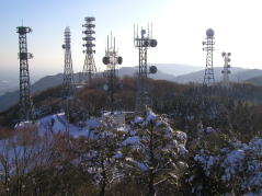 | 山行記 | ●ここは、物見山、岩巣山と登ってきてこの日3番目の山である。この山も山頂直下まで車道が通り、駐車場まで行ってしまえば数分で山頂に着いてしまう。 ●どこか歩くルートが見つかれば歩こうと思って雪道を車で登っていくが、上に行けば行くほど道の雪は多くなり、車が立ち往生する恐れも出てきた。山頂近くではついにわだちもなくなったが、行けるだけ行ってみようと登っていくと、さらに雪が深くなった駐車場に着いた。 ●車から降りてみてみると、雪は車の腹に当たるほどだった。こんな状態では、ここから登るのが精一杯だと思い出発する。 ●深く、雪の積もった踏跡もない道を、沿道にある、雪をいっぱい屋根に載せた祠を見ながら進むと、1〜2分で大きな展望台の立つ頂上に着いてしまった。 ●階段にもたっぷり雪の積もる展望台へ登ると、三国山のシンボルである巨大なアンテナ群や遠くは恵那山方面まで見ることができた。 ●展望台を下り、三角点や山名板などを探すがなかなか見つからず、ようやく木の山名札を一つ見つけたので、そこで記念写真を撮って戻ることにした。帰りに、野ウサギのものと思われる足跡を発見した。 |