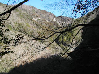 | 山行記 | ●愛知の130山の中でも、袖山岳、高畑とこの離山は手強い山というイメージが強く、なかなか手をつけていなかった。しかし、愛知の130山を完登するためには避けては通れないわけで、最後にこれらの山を残すのはあまりいい手ではない。ということで、今回この離山に挑戦することにした。 ●みどり湖から富山村方面の、途中から通行止めになっている道を進む。ほとんど車が通ったことが無いようで、舗装路の上に踏まれていない木の枝や葉が落ちていて走りにくい。はたして登山口まで行けるのか心配になってくる頃、庚申沢橋に着く。 ●橋を渡ったところにゲートがあり、車はここから進入できなくなっていた。橋の手前に駐車できるスペースがあったので、そこに車を停め、ゲートの脇を抜けて舗装された車道を歩き始める。登山口を見落とさないように注意しながら歩いていくと、ガイドブックやウェブで紹介されているとおりの、落石防護用金網出入口の登山口があった。 ●入口から沢を渡って右手を登りトラバースしながら登っていくと展望の開ける小ピークに出る。オオバヤシャブシの実やリョウブの実が青空に映え、足元にはまだまだ咲かないイワカガミの葉が目立つ。 ●再度樹林帯に入り登っていくと道はふかふかの落ち葉のトラバース道となる。しばらく進むと山頂へ続く尾根への取り付き点に出る。あとはその尾根をひたすら登るだけだ。滑りやすい急登だが、木の間越しに恵那山や茶臼山を見ることができる。 ●やがて、まだ雪の残る山頂に着く。山頂は展望が無く、木に山名札、その木の根元に三角点が食い込むように埋まっている。 ●帰りは来た道を戻るが、奥の深い山である。分岐点や屈曲点など間違えないように慎重に下りる。当初予想していたより道もわかりやすく、天気がよかったせいか明るく気持ちのいい山という印象が残った。 |