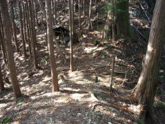 | 山行記 | ●愛知の130山は、ボリュームのある山が少ないので、何山かを組み合わせて登ることが多い。中でも距離的に中途半端な存在であったのがこの山だ。この日はたまたま昼から日程が空いたので、懸案であったこの山を目指すことに。 ●豊川から約1時間半かけて一本杉トンネルに到着。早速登り始める。ジグザグの道を登るとすぐに作業小屋の建つ峠に出る。後はそのまま尾根上を歩いていけばいいのだが、途中右に巻く道があり、この上が山頂なのかよくわからなかったので、とりあえず巻く道を行くことにする。 ●道は途中藪っぽくなっていったが、やがて小さな広場に出た。これから先に高いところが無いので、そこから通り過ぎてきた高いところへ直登することにした。難なく猿の置物の置いてある山頂に到着する。 ●帰りは正しい道を歩こうと、来た方向と反対側の踏み後を辿り下り始めた。ところがだんだん踏み後は薄くなり、いつまでたっても先程の分岐点には到達しない。いろいろ歩いた末、コンパスを出して方向を確認すると、どうやら正反対の方向へ歩いていたようである。 ●なにか、狐につままれたようであったが、コンパスを信じて下っていくとすぐに峠に到着し、一安心。やはりどんな山でもなめてはいけないということを改めて痛感した山だった。 |
