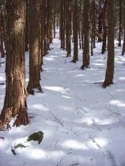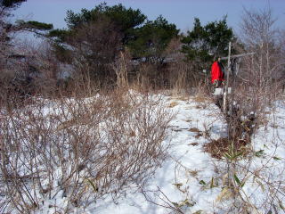 | 山行記 | ●いつでも登れるつもりで残してあった丸山を訪れる。 ●登山口まで車で行けると思っていたが、途中鏡のようにカチカチに凍っている部分があり、最初は強気に進むが、ノーマルタイヤなのでタイヤが空回り、おまけにコントロールできないままズルズル下がってきてしまった。しばらくなるがままになり、グリップできるところまで下がると、ブレーキとアクセルで無事脱出。向きを変え、雪のない道の隅に駐車。そこから歩くことにする。 ●先程車が通れなかった所は歩くのも大変で、ここだけのためにアイゼンを出すのも面倒だったので、ポールを使い慎重に通過する。 ●登山口はそこから10分程歩いた所で、滑る所は無いが雪が積もっていた。登山口からは規則正しく植えられた木の間を登っていく。 ●植林帯から雑木林に入り傾斜も緩んでくればもう山頂で、小広い広場になっている。山頂からは茶臼山なども展望でき、気候も暖かく、気持ちよさについつい長居したくなるが、そういうわけにもいかないので来た道を引き返す。道沿いにはフキノトウがいっぱい顔を出していた。 |