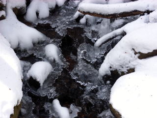 | あてび平入り口の小鳥茶屋 | 雪だらけのあてび平内の遊歩道 | 凍りつく流れ |