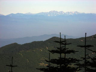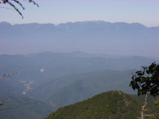 ![]() 南アルプスの山並み 仙丈ケ岳、北岳、間ノ岳、塩見岳、荒川岳まで望むことができる。手前の山肌には南アルプス林道が見える |