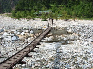 | 湯俣岳三角点 | つり橋と青嵐荘 | 大量の土砂で埋まる高瀬ダム湖 |