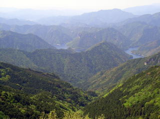 | 明神山から見る大鈴山と茶臼山 | 馬の背から振り返り見る明神山山頂 | 馬の背から見る鳳来湖 |