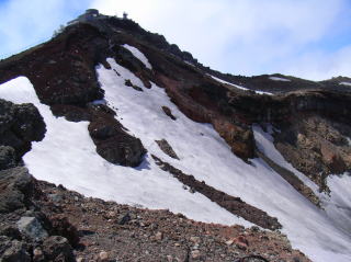 | 残雪の残る剣ヶ峰 | 火口とお鉢 | 青空と雲 |