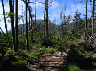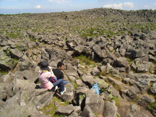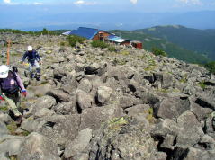 | 縞枯地帯から見る蓼科山頂 | 山頂手前から見る浅間山 | 山頂手前か蓼科山荘と縞枯現象を見る |