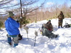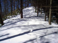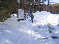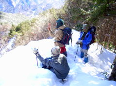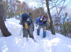 | 山行記 | ●久しぶりに雪遊びがしたくて大川入山を目指すことになった。愛知県内から既に雪が多く、天気も上々だし、今日は楽しい雪遊びができそうだと心が弾む。 ●治部坂高原スキー場の有料駐車場に車を停め、出発する。デンソーリゾート治部坂こまくさへ行く車道と別れ舗装道を暫く歩くはずだが、除雪がされておらず、2〜3人が歩いたであろうトレースが続いているだけだった。 ●いきなりいやな予感がする。先週降った雪が意外に多かった様で舗装路には60〜70cmの雪が積もっておりそれを頼りに歩くが足がとられてなかなか進まない。早くもラッセル状態だ。 ●舗装路から外れ、植林帯に入るがさらに雪が深くなり、傾斜が増す分余計に歩きにくくなってきた。踏跡を忠実にたどっていくが、さらに足が埋まってピッチが上がらない。 ●これではいつになったら大川入山に着くのかわからないので、今日は横岳までということにして、この青空と雪を楽しんで帰ることに全員一致で決定した。 ●そうなると気も楽になる。途中南アルプスのの展望が広がるところではその展望を心ゆくまで楽しんだ。横岳が近くなると吹きだまった雪でますます進まなくなり、判断は正しかったと納得した。 ●横岳山頂は、表示が見つからなかったがGPSと1/25000地図で確認し、そこで休憩することにした。横岳山頂から大川入山方面に少し行ったところからは隣の長者峰や茶臼山なども見ることができた。 ●下山途中でロープワークの練習をしたりしながら来た道を引き返した。目的の山へは行けなかったが、天気も良く、雪と青空と展望を十分楽しむとができた。 |