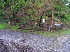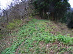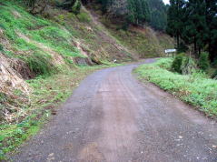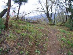 | 林道の東尾根登山口方面との分岐 | 東尾根登山口 | 斜面いっぱいに咲くミヤマキケマン | ブナ尾根取付点 |