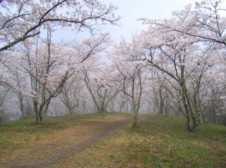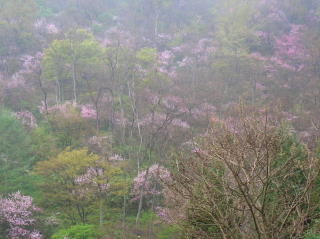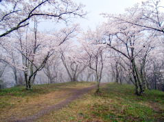| 雨の中 頂上まで続く桜満開の登山道を楽しむ | ||