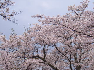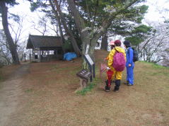 | 桜並木手前から見た花桃の山肌 | 山頂手前の広場の桜 | 山頂手前の広場と桜 |