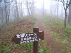 | 山行記 | ●以前この辺りを通ったとき桜が頂上まで咲き上がっている山を見たことがあったが、それがこの光城山だとは知らなかった。登山としては行程が短か過ぎて魅力に欠けるが、桜の咲く頃はさぞかし素晴らしいことだろうと思い遥々来てみることにした。 ●天気予報は午後から雨ということだったが、駐車場に着いた時には既に小雨が降っていた。せっかくここまで来たのだからとカッパを着て出発する。駐車場からさくら池の傍らを花桃などを楽しみながら尾根に取り付く。この辺りは桜もかなり散っていて心配になるが、足下にはイカリソウが群生し目を楽しませてくれる。 ●ジグザグの登山道は緩やかに登るものや急に登るもの等何本も付けられており、やや急なこの尾根を体力に合わせて登ることができる。中間点辺りからは桜も見頃を迎えており、立ち込めたガスとで晴れた日のそれとは一味違った趣を見せていた。 ●山頂直下の広場の辺りでは一瞬晴れ間も出たが、以降は雨の山行が続いた。山頂には三角点がありその一帯には古峰神社やバイオトイレ、休憩所などがあり、この天気にもかかわらず老若男女の多くの登山者が休憩をしていた。 ●山頂からは北廻りコースと呼ばれる桜並木の尾根より1本隣の尾根を下りることにした。北廻りコースはジグザグで緩やかなよく整備された道が付けられており、道沿いではヒトリシズカやセントウソウ、ジュウニヒトエ等多くの花を見ることができた。 ●見頃を迎えた花桃が見えてきたら桜並木コースとの分岐は近い。下山後は近くの温泉に入った後、白馬まで足を伸ばし、知り合いが脱サラして経営する自然薯料理の店へ行き、その近くにあるザゼンソウ群生地などを見ながら帰路についた。 |