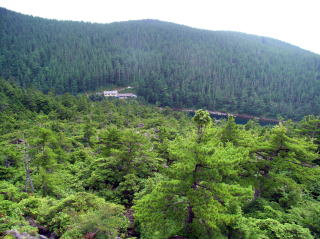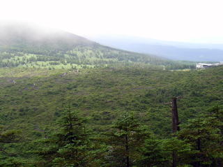 | 観光客で賑わうロープウェイ山頂駅 | 横岳の下りから見た坪庭とロープウェイ山頂駅 | 坪庭と縞枯山 |