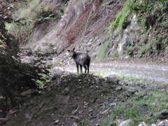 | まだ暗い戸中のゲート | 林道に現れたニホンカモシカ | 林道には作業小屋が各所にある | 登山口 |