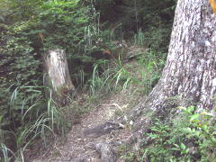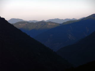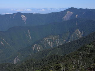 | 山行記 | ●夏休みがとれたので、たまには暑い地元の山ではなく、少し標高が高くボリュームのある山へ登ろうと思い、当初池口岳を考えたが、コースタイム12時間は日も短くなってきたこの時期では少しきつそうで、しかもヒルが多いということで断念し、前から気になっていた黒法師岳へ登ってみることにした。 ●とは言っても、同じ南アルプス深南部の山でありヒルには警戒が必要だし、ガイドブックによっては黒法師岳往復だけでも11時間かかるというものもあったが、往復2時間ずつは林道歩きなので何とかなるし、うまくいけばハイマツの南限とされる丸盆岳まで足を伸ばすことも可能だ。 ●車を置く予定の戸中のゲートまで余裕を見て4時間ぐらいと考えていたので、未明の1時30分頃豊川を出たが、途中の買い物の時間を入れても2時間30分ぐらいで目的地に着いてしまった。まだ暗いしヘッドランプも持っていなかったのでどうしようかと考えたが、車内に備えてある懐中電灯を点け、クマ避けのカウベルとラジオで武装して出発することにした。 ●気味が悪いので、暗い林道はもう二度と歩かないことにしようと心に決めていたのに、結局また歩くことになってしまった。今回も明るくなるのを心待ちにしながら歩いていると、突然ニホンカモシカが林道に現れて驚いたが、クマでなくて良かったと心から思った。林道を暫く行ったところでようやく明るくなってきた。明るくなってくると気分が違う。周囲の山に日が差してくるのを見ながら、傾斜がきつく舗装はされていないが、よく整備された林道を歩き、2時間弱で登山口に到着した。 ●ガイドブックでは林道支線から北へ登って尾根に取り付くことになっていたが、実際には林道本線から南に登って尾根に取り付くようで、最初は少し戸惑ったが、はっきりした案内と登山道がついていたので、それを信じて進むことにした。 ●登山道は急に上って10分足らずで尾根に取り付く。最初は比較的新しい伐採地を歩くので、明るいが伸びたススキなどが登山道にかかり、これらをかき分けながら進まなくてはならず先が不安になるが、やがて樹林帯に入ると、傾斜は急になるが下草はなくなる。かなり急な斜面を登り、ガレ場を過ぎると一旦下って鞍部と呼ばれるところに出る。そこから再び急な斜面が続くが、稜線に出る直前の急登はこれまた大変だった。 ●稜線に出ると急に展望が開け、笹の海の向うに黒法師岳や丸盆岳が大きく見え、周囲の山々も見えてきた。ここからまずは黒法師岳を目指す。登山道は丈の低いササに覆われて所々見失いかけるが、稜線に沿って進めば間違えることはない。登り始めるとすぐ、逆光ぎみでのシルエットが美しい富士山も見えてきた。ガレ場を抜け再び笹の中の急登をこなせば、傾斜は緩くなり、低い樹林に囲まれた小広い黒法師岳の山頂に着く。視界が悪いが居心地のいい山頂には、三角点マニアにはたまらない日本で唯一の×印の三角点がある。 ●ここまで約4時間30分。これなら丸盆岳も狙えるので、一旦稜線出合まで戻り、今度は黒法師岳とは反対方向の丸盆岳を目指す。丸盆岳へは稜線出合から一旦下り、ササの斜面を登る。この登山道も最大膝ぐらいまでの低いササに覆われていて、しばしば道を見失うが、山頂は見えているし、どこを歩いても歩けないところはないので、正しい登山道を探しながら歩いているうちに、いつの間にか丸盆岳山頂の真横まで来ていた。 ●丸盆岳山頂はそこから右に上ったところだ。狭い山頂だが展望がよく、黒法師岳や南アルプスの峰々、今日登ってきた登山口から続く尾根を一望することができる。また山頂には、ここが南限とされるハイマツを見ることができ、なんだか得した気分になる。 ●何時までも大展望を眺めていたいが、長い下りと約6kmもの長い林道歩きが待っている。お楽しみもそこそこにして撤収し、来た道を戻ることにした。 |