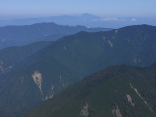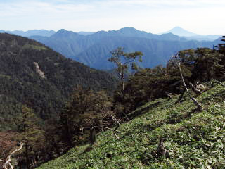 ![]() 黒法師岳の下りから見た丸盆岳と南アルプスの山々 |