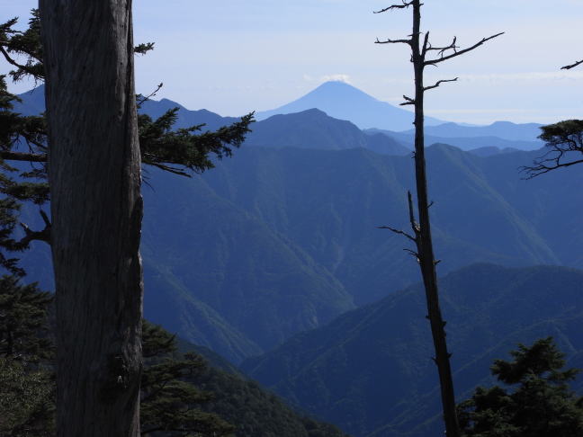 | 黒法師岳の下りから見た大無間山と富士山 | 丸盆岳への登りから見上げる丸盆岳 | 丸盆岳から見た黒法師岳と前黒法師山 |