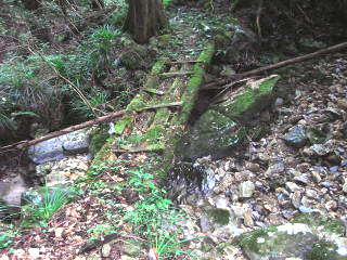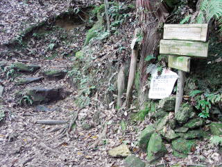 | 柿野北登山口 | 朽ちて苔むした丸太の橋 | 柿野北登山口分岐 |