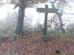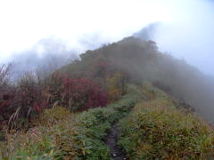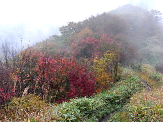 | 山行記 | ●前日宿泊した休暇村蒜山高原から百合原牧場近くの駐車場に向かう。雨がしとしと降っているが、せっかくここまで来たのだからとカッパを着て出発。ジャージー牛が沢山いる牧場内を歩くと、その牧場のはずれが登山口だった。 ●登山口からいきなり木の階段の急登が始まる。木の階段は所々朽ちて壊れており、しかも粘土質の土が滑りやすい。それをなんとか登って、周囲の開けた広場に出ると、そこに「二合目」と書かれた案内標柱があった ●その二合目からは展望のいい笹の尾根歩きとなるが、生憎の雨で遠くまでの展望は得られない。五合目辺りから紅葉の山肌が見えて美しいが、粘土質の登山道は雨の影響もあり滑って歩き難い。 ●八合目である槍ヶ峰を過ぎてもガイドにある大山の展望はおろか、これから目指す上蒜山の山頂すら見ることができなかった。しかし、この辺りから背の低いカエデの類やミズキの類の紅葉が美しく、それが山腹の方まで広がっていた。 ●八合目付近から傾斜が緩くなってくるが、雨は止む気配が無く、山頂に近付くにつれ風も強くなってきた。山頂は特に風雨が強く、のんびり休憩しているわけにはいかないので、早急に下山を開始することにした。 ●下山は粘土質の登山道が、往きと比べても雨で更に滑りやすくなっており、慎重に下山。昨晩宿泊した休暇村蒜山高原で日帰り入浴して帰路に着いた。 ●予報ではこの土日は晴れることになっていたが、結果的には大山に登った昨日を含めて両日とも天気には恵まれなかった。予報が完全に外れたこともあるが、つくづく山の天気はわからないものだということを改めて実感させられた山行だった。 |