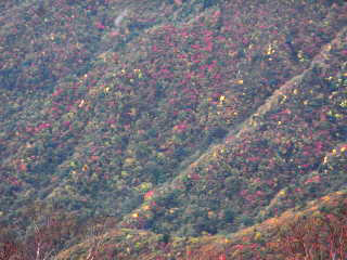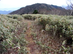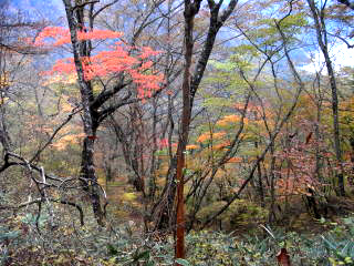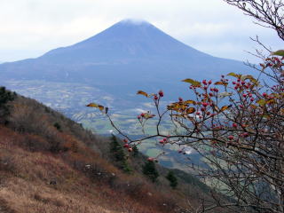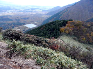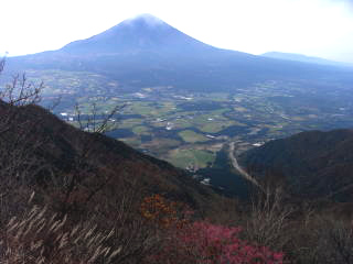| 山行記 | ●毛無山は、初回登ったとき下山途中で転倒し足を骨折したという忘れられない山で、計画をする際にも色々と余計な思いがよぎる。加えてバスの利用が不便なこの辺りの山を縦走するのは、車の回収を考えるとなかなか難しい。そんなことを思いながら地図を眺めていると、山麓に東海自然歩道がうまい具合に整備されていることに気付き、これを利用しない手はないと今回の計画を思いついた。 ●豊川を未明の3時に出発。朝食や買出しをしながら駐車場として利用する予定の、道の駅朝霧高原を目指す。道の駅に着いたのは6時前でまだ薄暗いが、今日の行程は長いので仕度ができ次第出発することにした。 ●まずは道の駅から国道を挟み反対側に伸びている道を進む。いきなり車止めがあるがこれを越えて進むと東海自然歩道の案内が見つかる。ここは自然歩道の雨天時等の迂回路になっており、これを辿れば毛無山登山口である麓まで行くことができる。麓までの道はほぼ平坦で、富士やこれから登る毛無山の紅葉した山腹を見ながら整備された道を進む。麓で東海自然歩道を離れ、直進すれば毛無山登山口だ。 ●登山口には麓神社があり、前回の件もあるので、この先の安全な登山をお願いして登山道を進む。涸れた沢を渡ると本格的な山道が始まる。一合目毎に標柱の立つ登山道は終始急な登りが続く。二合目を過ぎてすぐ滝見台があり、今真っ盛りの紅葉の中に雄大な不動の滝を見ることができた。珍しいホーローの看板のある五合目あたりから葉の落ちきった雑木林となってきて、木の間越しに富士の姿がはっきり見える。 ●標高差約1100mのきつい登りも九合目を過ぎた辺りから緩やかとなり、やがて稜線に出る。ここまで来れば山頂はあと少しだ。途中北アルプス展望台と案内のある大きな岩があり、試しに登ってみると、生憎の曇り空で、北アルプスまでの展望は利かないものの、南アルプスの主要な山々は全てといっていいぐらい間近に眺めることができた。 ●毛無山の山頂は小広く、富士方面に大きな展望が広がる。山頂には一等三角点が置かれており、御馴染みの山梨百名山の標柱と静岡側でよく見る標柱が仲良く立てられている。 ●毛無山からは稜線を北上する。夏には高山植物が咲くという展望のいい草地を歩けば天子山塊最高所となる大見岳に着くがここだけ樹林の中で展望は無い。大見岳からは一旦下り、登り返したところがタカデッキということだが、山名表示は無い。タカデッキ山頂付近はササが多く、歩いてきた大見岳が見え、朝霧高原の向うに聳える富士山が大きく見える。タカデッキからは大きく下り、少し登り返したところが雨ヶ岳山頂だ。 ●雨ヶ岳山頂も展望がよく、ここでは学生や多くのパーティーがくつろいでいた。ササの向うに大きなタカデッキや富士山が見え、富士五湖の向うには御坂山塊や道子山塊を望むことができた。また、足下の朝霧高原の中に車を置いた道の駅朝霧高原もはっきりと確認することができた。 ●雨ヶ岳からはまたまた大きく下る。下り道の涸れた樹間越しに本栖湖や竜ヶ岳を見ることができた。ここが最低鞍部ではないかと思うところから少し登ったところが端足峠で、ここが朝霧高原への下山口になるが、時間もあるのでその先の竜ヶ岳も登ることにした。 ●竜ヶ岳への登りは展望のいいジグザグの道を登り、その後平坦なササの中の道を進むが、そのササの道が意外と長く、感覚的にはかなり歩いてやっと広々した竜ヶ岳山頂に到着した。竜ヶ岳山頂は大展望が広がり、今歩いてきた雨ヶ岳や富士山は勿論、南アルプスや八ヶ岳など多くの山々を望むことができた。 ●ひとしきり展望を楽しんだ後、先程の端足峠へ戻り、朝霧高原方面へ下りていく。細かいジグザクの急斜面を下ると東海自然歩道と合流する。東海自然歩道をA沢貯水池を経て梶原の吊橋を渡り、途中で再び迂回コースを進めば道の駅朝霧高原に戻ることができる。行程中終始富士が見えたスペシャル縦走コースもこれでフィナーレとなる。 |