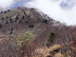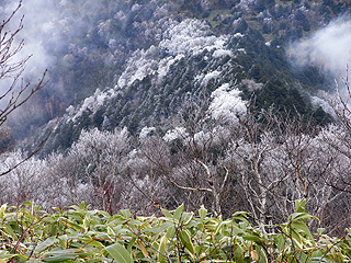 | 霧氷が見られる霊仙寺山 | 霊仙寺山の山腹 | 飯綱神社のあるピークにも霧氷が |