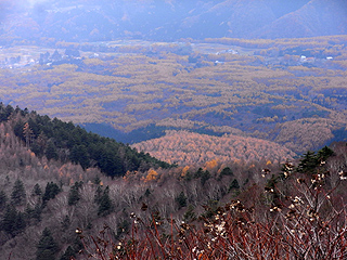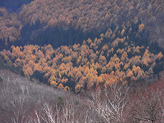 | 霧氷が残る西登山道 | 下山途中に俯瞰するカラマツの黄葉 | カラマツの黄葉が絨毯のように広がる飯綱高原 |