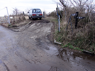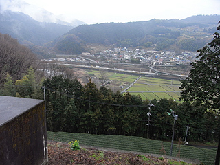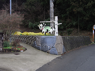 | 九十九折の舗装道から見た谷峨駅方面 | 牛の看板から山道に入る | 町道出合とトイレ |