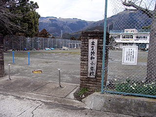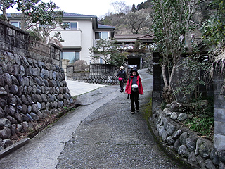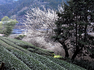 | 地蔵岩で舗装道に出る | 共和小学校と大野山 | 茶畑と梅の花が美しい |