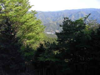 | 稜線分岐 | 見晴らしのいい岩場 | 岩場からは新緑の山と宮崎小学校が見える |
