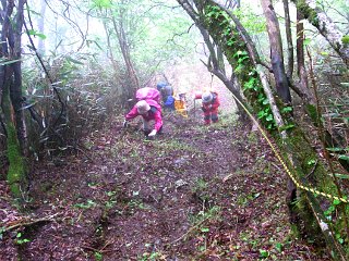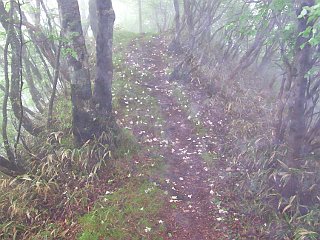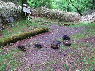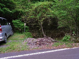 | 安倍峠付近の駐車スペース | 旧安倍峠 | シロヤシオの花が落ちている登山道 |
