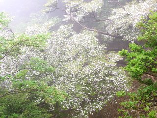 | 満開のツツジを見ながら巨木の林立する稜線を歩く | ||